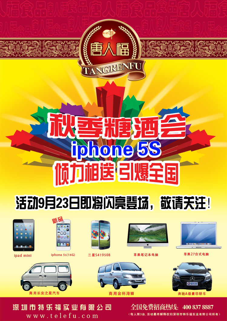 2013秋季糖酒會提前大放價,Iphone 5S傾力相送、引爆全國!活動9月23日即將閃亮登場,活動禮品iphone5S、高級商務汽車等,眾多高端商務禮品等你拿。欲了解活動細節(jié)敬請于9月23日當日登陸唐人福企業(yè)官方網(wǎng)站