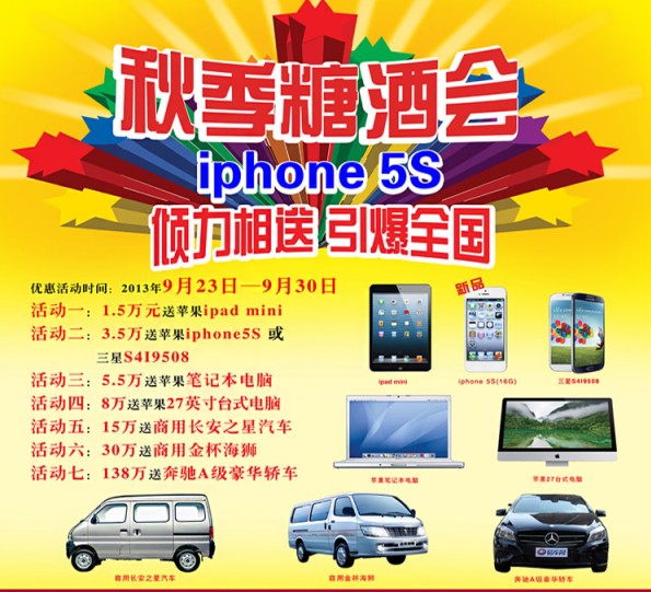 關(guān)鍵詞:2013年秋季糖酒會(huì)9月23-30日傾力相送、引爆全國 2013秋季糖酒會(huì)優(yōu)惠時(shí)間9月23日-30日iphone5S、商務(wù)汽車傾力相送、引爆全國!活動(dòng)內(nèi)容有: ![]() 一、1.5萬送蘋果ipad mini; 二、3.5萬送蘋果iphone5S或三星S4 I9508; 三、5.5萬送蘋果筆記本電腦; 四、8萬送蘋果27英寸臺(tái)式電腦; 五、15萬送商用長安之星面包車; 六、30萬送商用金杯海獅面包車; 七、138萬送奔馳A級豪華轎車。 數(shù)量有限、先到先得。詳情請登錄網(wǎng)站或拔打4008378887【唐人?!?nbsp;