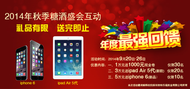 關(guān)鍵詞:唐人福2014年秋季糖酒會iPhone6派送開始啦 2014年秋季糖酒盛會互動!9月20-26日年度最強優(yōu)惠: ⒈壹萬送1000現(xiàn)金券; ⒉叁萬元送iPad Air; ⒊伍萬元送iPhone6(限量)。 活動期間承諾相應(yīng)銷售即可免費獲取相應(yīng)禮品,吊炸天的IPHONE6怎能錯過! 詳情登陸網(wǎng)站m.cqdjjp.cn或免費咨詢:4008378887 唐人福高端無糖禮包領(lǐng)導(dǎo)者,派送禮品同樣高端。 ![]() |