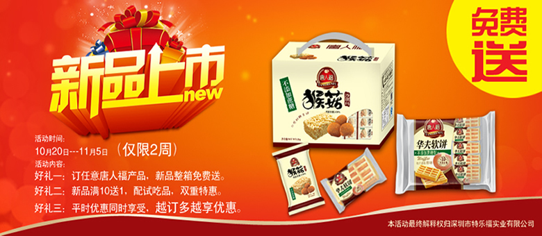 關(guān)鍵詞:【 嘗新享特惠】新品上市0元送 ![]() 活動主題:新品上市免費送 活動時間:10月20日---11月5日(僅限兩周) 活動內(nèi)容:秋風(fēng)起送好禮!全新猴頭菇沙琪瑪、華夫軟餅上市整箱免費送! 好禮一:訂任意唐人福產(chǎn)品,新品整箱免費送 好禮二:訂新品,可配試吃品,雙重特惠 好禮三:平時特惠同時享受,越訂多越享優(yōu)惠 詳情登陸:m.cqdjjp.cn或致電400-837-5878免費咨詢 本活動最終解釋權(quán)歸深圳市特樂福實業(yè)有限公司 上一條: 【濟南】無糖食品好生意源自消費者需求