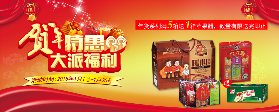 賀年特惠大派福利--年貨禮包滿5送1編輯:唐人福 發(fā)布時間:2014-12-31 17:36:38 瀏覽次數(shù):3123人次